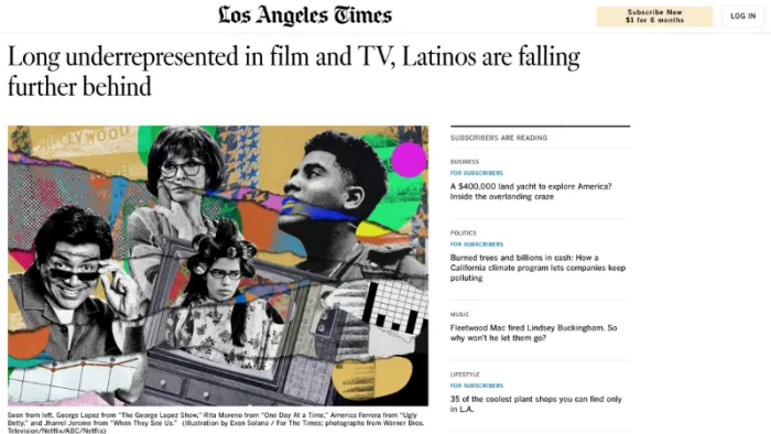 - Use this article from the LA Times to spark a conversation about Latino representation in the media. Are there any surprising statistics? Students can discuss the importance of representation and potentially identify an example of when they "saw" themselves in the media.