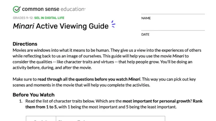 - Students will rank certain character traits in order of how important they are to personal growth. Importantly, they’ll return to this after the movie and reflect on it.