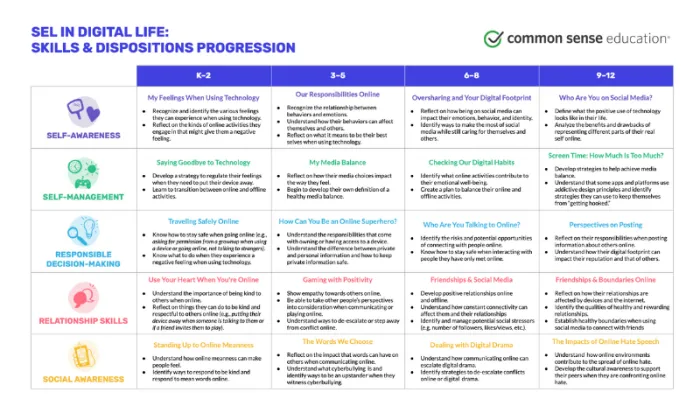 The table below outlines the K-12 SEL skills and dispositions covered in the Common Sense SEL in Digital Life activities. You can also click to open the table in a Google Doc.