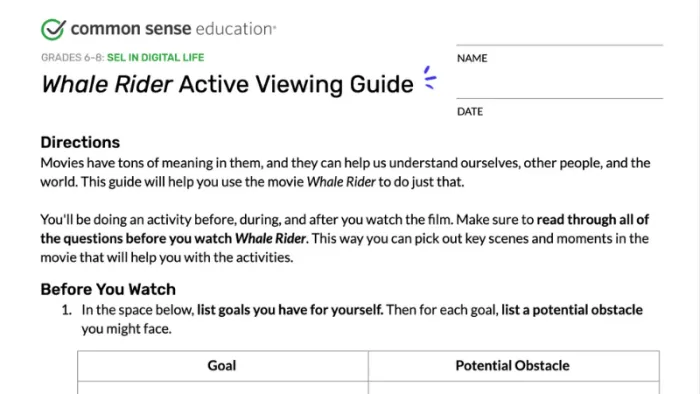 Hand out copies of the Whale Rider Active Viewing Guide, and give students a few minutes to finish the Before You Watch question.