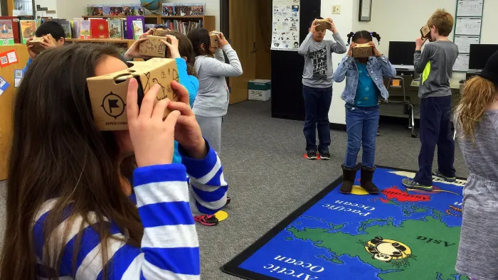 In addition to these research-based suggestions, there are some practical things to be mindful when using VR. First and foremost, make sure you have a large, open space for students to safely explore -- like a library or gym. Even if you're only using Google Cardboard, kids will want to spin around so they should each have more than an arm's length of space all around them. A lot of VR can also be done sitting down, so students could still be at their desks. There's also a risk of students finding VR to be disorienting, or feeling sick. This is another reason why it's good to limit VR to short experiences, and to make sure to check in with students to see how they're feeling.