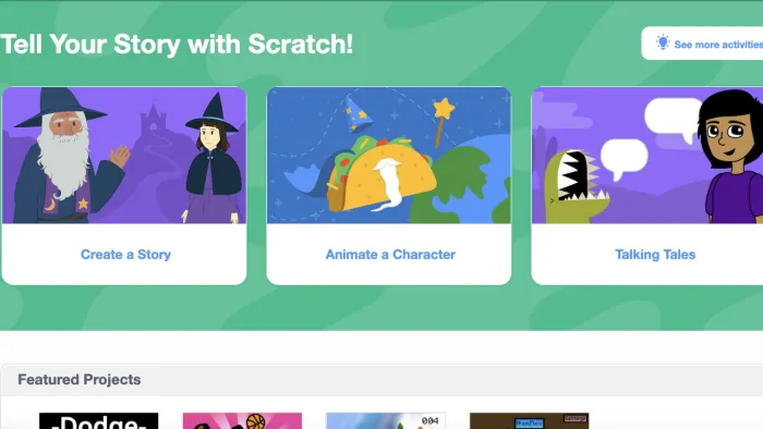 Perhaps the true genesis of the coding surge, Scratch is a launchpad for many other platforms. It offers tutorials for kids, printable step-by-step cards, ideas for teachers, and a robust educator community. Teachers can use the Creative Computing Curriculum if they need a more scaffolded process. It also has lots of project options, like music, art, games, stories, and more. Plus, there are Studios that are themed communities. However, it doesn't have the bells and whistles or extensive options that either Code.org or Tynker has. That said, Scratch is more targeted, so it might be the right choice for elementary coding learning and fun. If you want more Scratch content that's thoughtfully organized into themed, video-based lessons, check out Google CS First, which has cool, cross-curricular lessons in both English and Spanish. Like Tynker, there's an early learning version called ScratchJr and a PBS Kids mash-up app.
