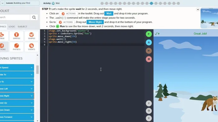 The next best tool, that still gives teachers lots of support and provides scaffolding for students, is Codesters. Students can play around in a sandbox environment, create games and apps, get immediate feedback, and use a peer review option. It has its own LMS, lesson plans, PD, and an educator guide, though it's not free like Code.org. It focuses on the Python coding language and it's primarily for middle school, but there's a set of cool cybersecurity courses that widens its breadth a bit. If you're looking for other options that serve as a bridge from blocks to text, you can also check out CodeMonkey and Codementum.