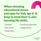 Navigating the world of children's media, from TV shows and podcasts to apps, games, books, and movies, can feel impossible at times. As parents and caregivers, how do we know what content is actually educational? Or if it has a positive influence, like helping kids build character, see themselves represented, or spark creativity? When choosing content and activities, let your child's interests be your guide, or consider what you'd like your child to learn. Find unbiased reviews from Common Sense Media, with recommendations across all ages, subjects, and types of media.