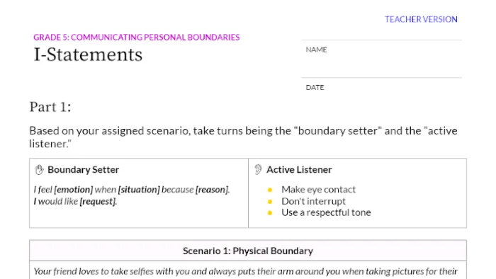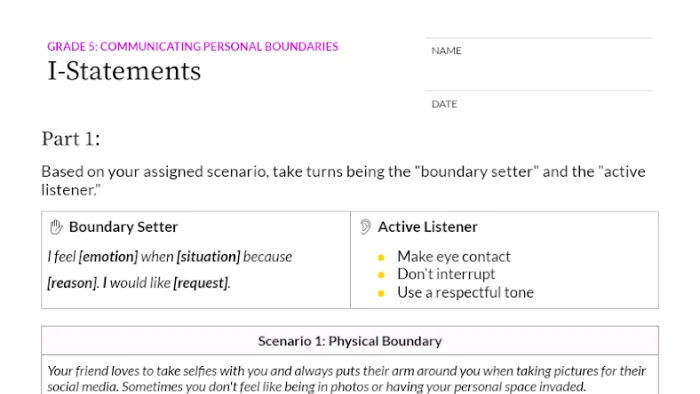 From dealing with unwanted photo sharing to social pressures, teach students how to establish and communicate clear boundaries, turning uncomfortable moments into clear, respectful ones. In this lesson, students will learn how to formulate "I" statements and practice active listening, fostering healthy relationships both on- and offline.