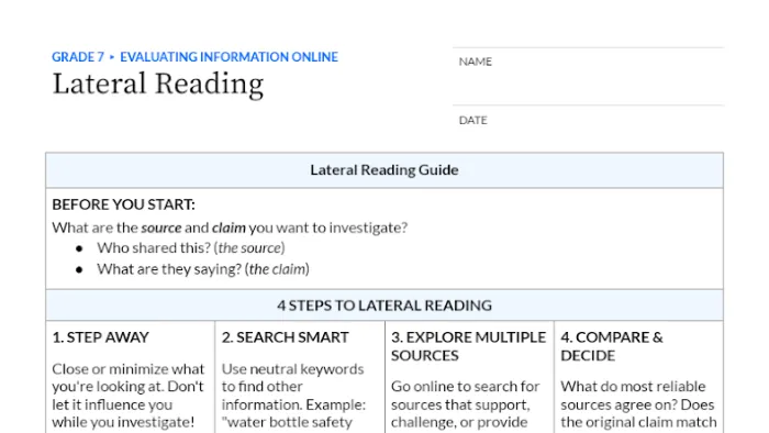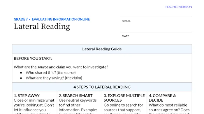 Can you spot what's trustworthy online? In this lesson, students learn about lateral reading—a key strategy that anyone can use to evaluate online information—and practice applying this skill to real-world examples. By learning to leave a source and investigate its claims elsewhere, students develop critical thinking skills that help them navigate an increasingly complex information landscape.
