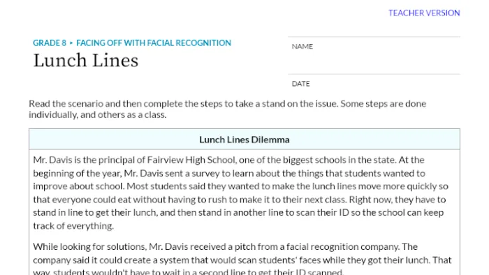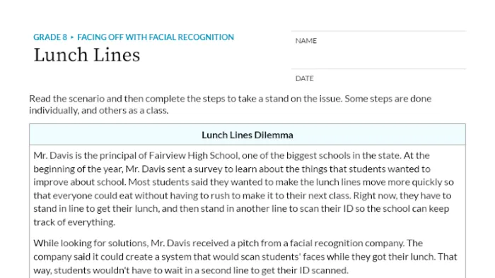 Facial recognition is one of the many applications of AI technology. Like other technologies, facial recognition offers both opportunities to improve our lives and potential risks. Use this dilemma and thinking routine to help students consider the benefits and drawbacks of facial recognition.