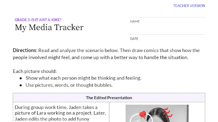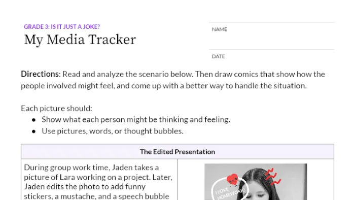 Kids are constantly exposed to humor online, from memes to GIFs and YouTube videos. But what makes one person laugh might make another person feel hurt or excluded. This lesson helps students develop their "humor compass," meaning the ability to distinguish when online humor shifts from fun and playful to mean and hurtful. By analyzing scenarios from multiple perspectives and examining the common defense that it's "just a joke," students build crucial empathy skills for becoming upstanding digital citizens.