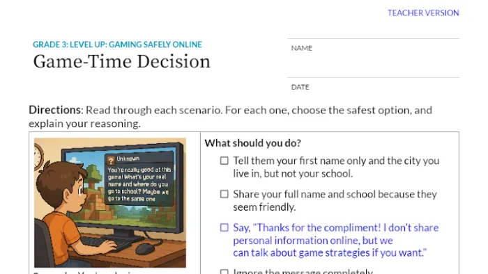 As online gaming worlds like Roblox, Minecraft, and Fortnite become central to students' social lives, knowing how to protect personal information is as crucial as mastering the next level. In this lesson, students develop essential privacy skills for gaming environments: creating usernames that shield their identity, recognizing what information should never be shared in game chats, and identifying when to involve trusted adults—building their confidence to navigate gaming spaces safely.