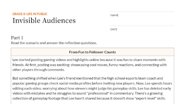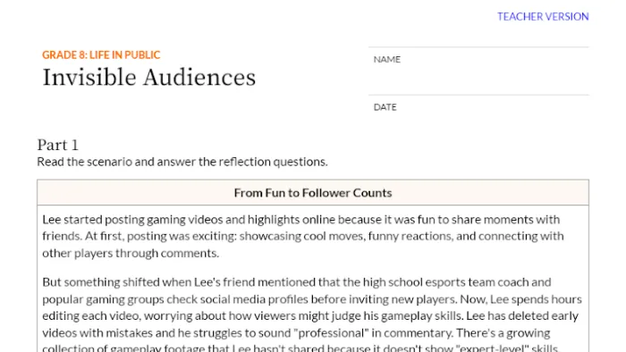 Delete post? Edit again? Keep private? Every day, students make choices about their online presence with unknown future audiences in mind. This lesson explores the tension between authentic self-expression and curating a digital footprint, helping students develop strategies to navigate life in public.