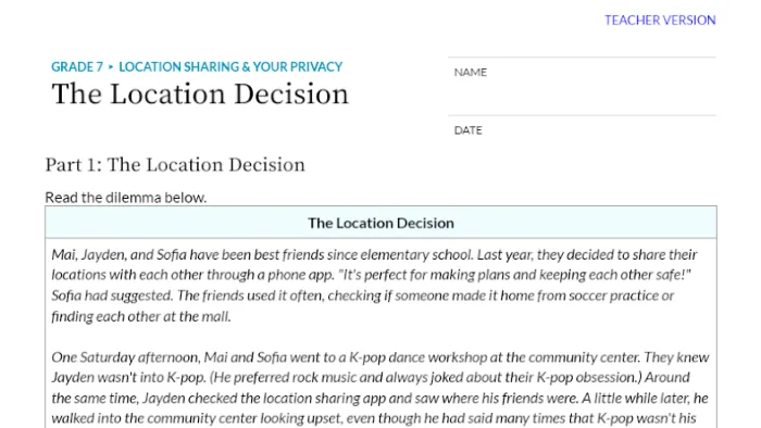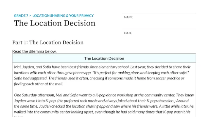 In a digital world where we are constantly "on display," having access to privacy can feel like a luxury. Yet privacy is a building block of self-expression, healthy relationships, and safety. In this lesson, students use the real-life issue of location sharing to discuss how the decisions we make about what we share online—and with whom—impact our safety and well-being.