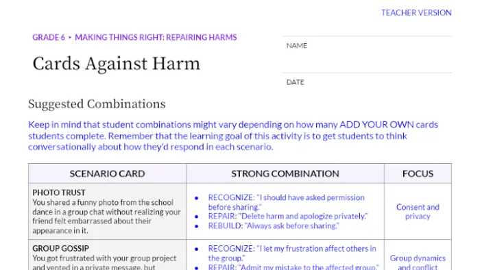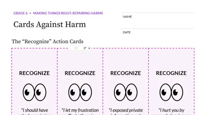 Everyone makes mistakes online—what matters is how we respond afterward. This lesson introduces students to the three-step framework to address online harm: Recognize, Repair, and Rebuild. By playing an engaging card game, students develop practical strategies for taking responsibility when online actions cause harm. They'll learn that digital mistakes, while impactful, can become opportunities for rebuilding trust and stronger relationships when handled with care and accountability.