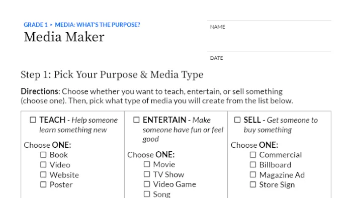 Students discover that people create media for three main reasons: to teach, entertain, or sell something. By sorting different examples and creating their own media, students learn to ask: Who made this, and why did they make it?
