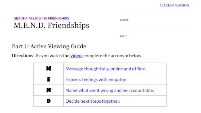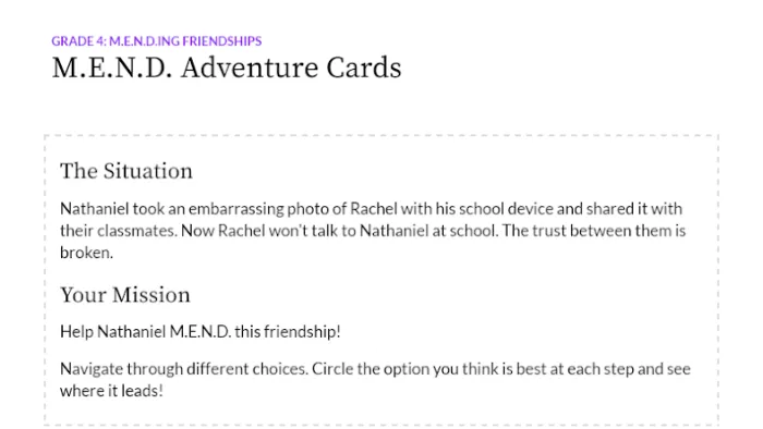 How do you repair a friendship when trust is broken online? In this lesson, students discover that "sorry" is just the beginning as they practice the MEND approach—making meaningful choices that either strengthen or weaken trust between friends. This engaging lesson teaches students that mending online hurt feelings requires honest conversations, taking responsibility, and following through on promises to be a better friend.