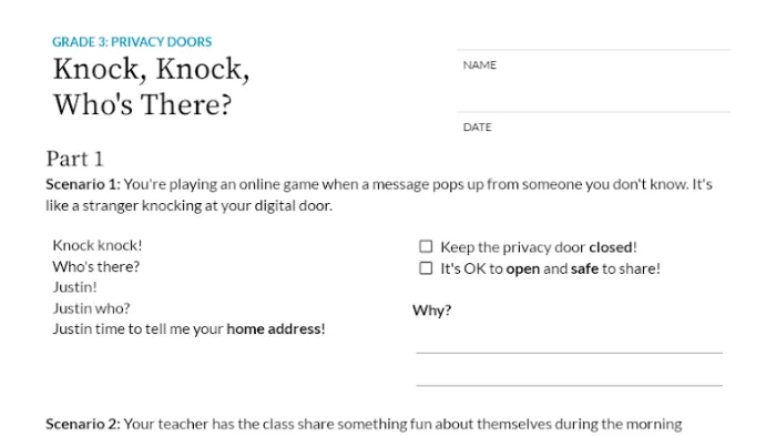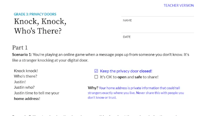 Just like the doors in our homes keep us safe by letting us decide who comes in, students need "privacy doors" to protect their personal information online. This lesson helps students understand when it's safe to share information and when to keep their privacy door closed. Through playful knock-knock jokes that mirror real online scenarios, students will practice making smart decisions about what personal details to share and what to keep private.
