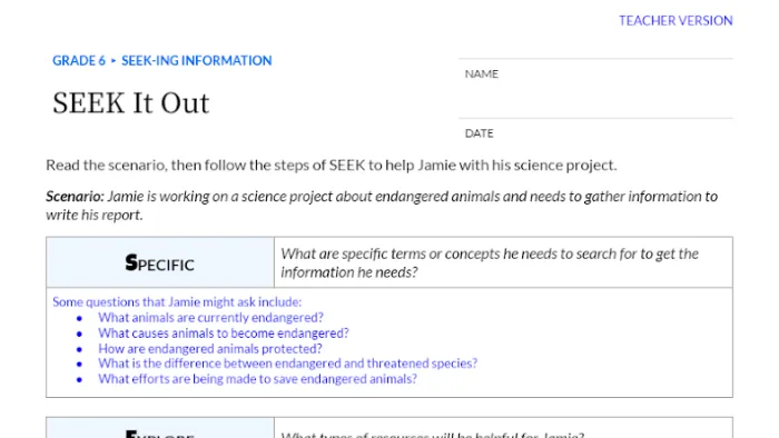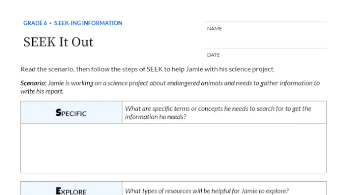 The internet is home to more information than any single person can handle. Knowing how to search for information is essential for navigating the labyrinth of the internet. This lesson introduces students to SEEK, a strategy that supports their ability to be specific in their searches and identify appropriate sources of information.