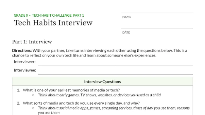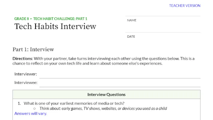 What if we slowed down to consider our tech habits, including what we do that serves us well and what we might want to change? In the first part of this two-part lesson, students interview each other about their current tech habits, engaging in personal reflection while learning about the role that media and tech play in their peers' lives. This lesson sets students up for Part 2, where they learn about how to make healthy habits stick and develop personalized plans to support their digital well-being.