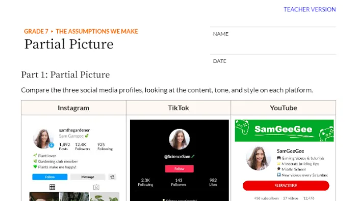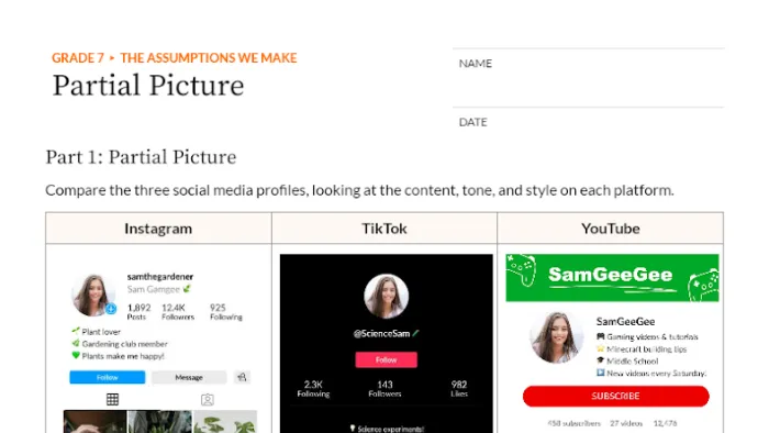 Online, we only see "partial pictures" of others, and they only see parts of us. Help students uncover how self-presentation varies across platforms, and how others form impressions from these curated glimpses. They'll examine assumptions made from limited information and explore the relationship between how we present ourselves and how others perceive our digital presence.