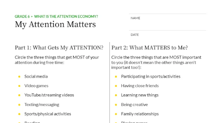 In today's digital world, our attention has become a valuable commodity that tech companies compete for. This lesson helps students understand the "attention economy"—how apps and platforms are designed to capture and monetize our attention through specific design tricks. Students will reflect on their own attention habits, recognize the tactics used to keep them engaged online, and develop practical strategies to align their tech use with what matters most to them.