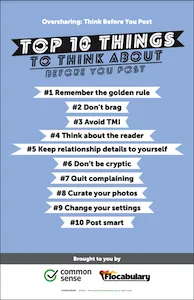 Inspired by our digital citizenship music video co-produced with Flocabulary, Oversharing: Think Before You Post, these 10 tips remind kids to be thoughtful about their digital footprints now and in the future.